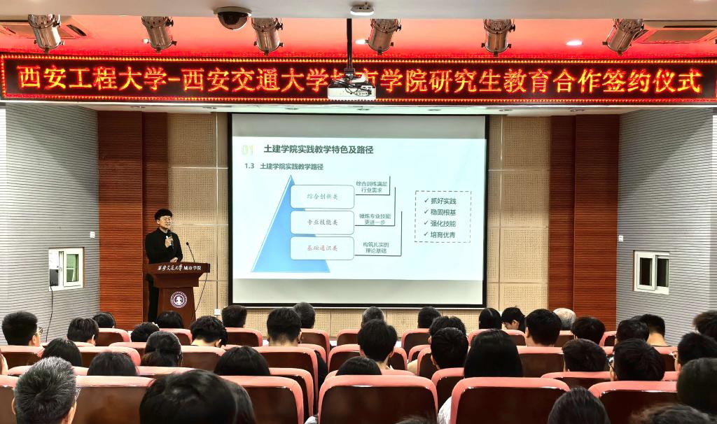 签约仪式后,学校土建学院实验中心负责人戴世安从土建学院实践教学特色、实验中心组成及实践能力培养模式等方面汇报了米乐官网学生培养情况。西安工程大学强天伟教授和刘洋教授分别对建筑环境与能源应用工程、土木工程两个专业的基本情况和发展前景进行了宣讲,并鼓励学生积极报考西安工程大学。