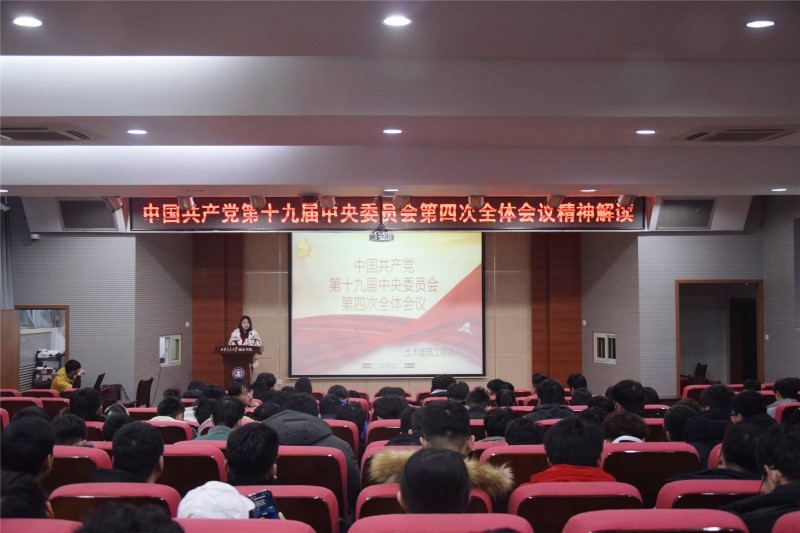 土木建筑工程系于12月25日在F100报告厅召开会议,师生集中学习十九届四中全会精神,系团学工作负责人吴丹主持和引导全体学生党员、积极分子和班团干部一同参与本次学习。