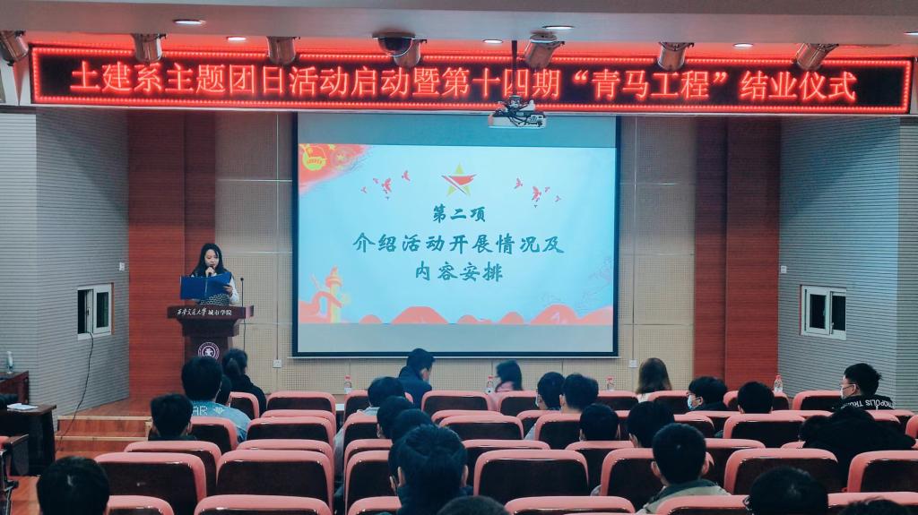 大会伊始,全体起立,共同奏唱共青团团歌。首先,由康璐老师介绍本次主题团日活动开展情况及内容安排,并要求各团支部能够创新活动形式、丰富活动内容。随后,土木2101班团支部书记吴佳乐同学从思想方面、学习方面和活动方面进行优秀团支部工作活动经验分享。
