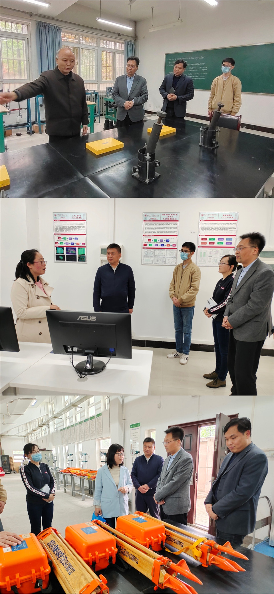 随后,土建系实验室主任龙玉成等教师陪同周总一行参观了土建系BIM仿真实训室、土力学实验室和土木工程材料实验室,在实践教学平台建设和环节管理等方面进行了深入交流和讨论。