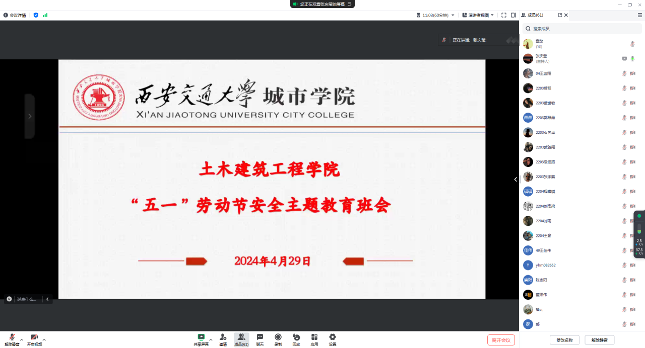 五一假期即将来临,这是一个大家期盼已久的小长假。但是,随之而来的是大规模的出行潮。为了确保大家在五一假期中的安全,土木建筑工程学院于2024424-28日分别在线上线下开展了假期安全主题班会,旨在提醒大家注意出行安全和消防安全。